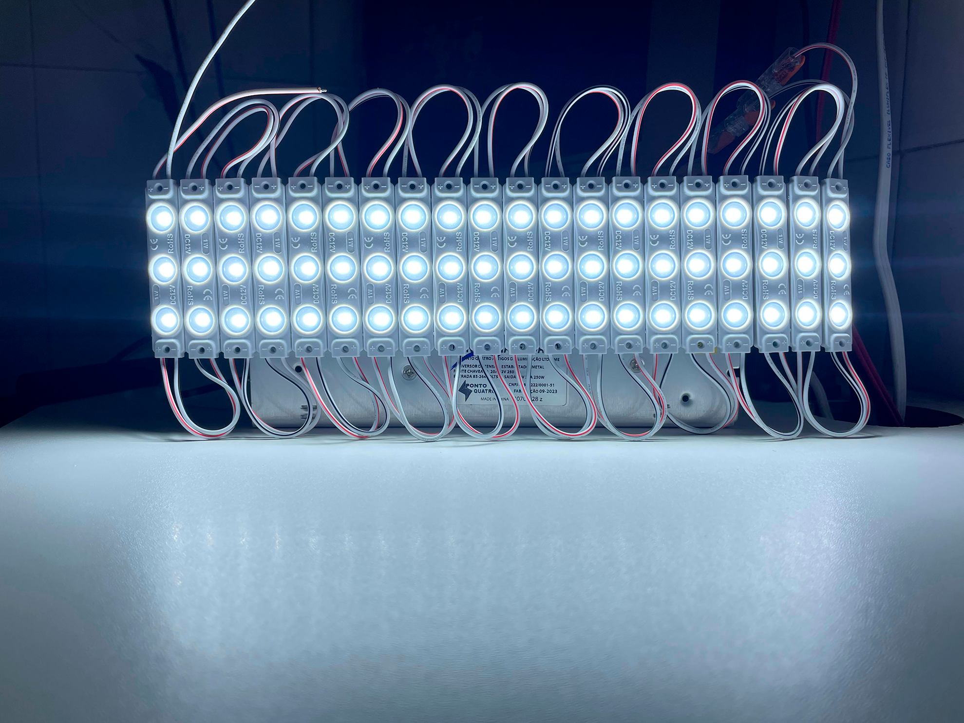 100 Módulos Led Luz Fria 6500k com lente 3 Pontos 1w IP67 12V IRC 80 Para Letras Caixas Comunicação Visual Ref : 3079 / 445