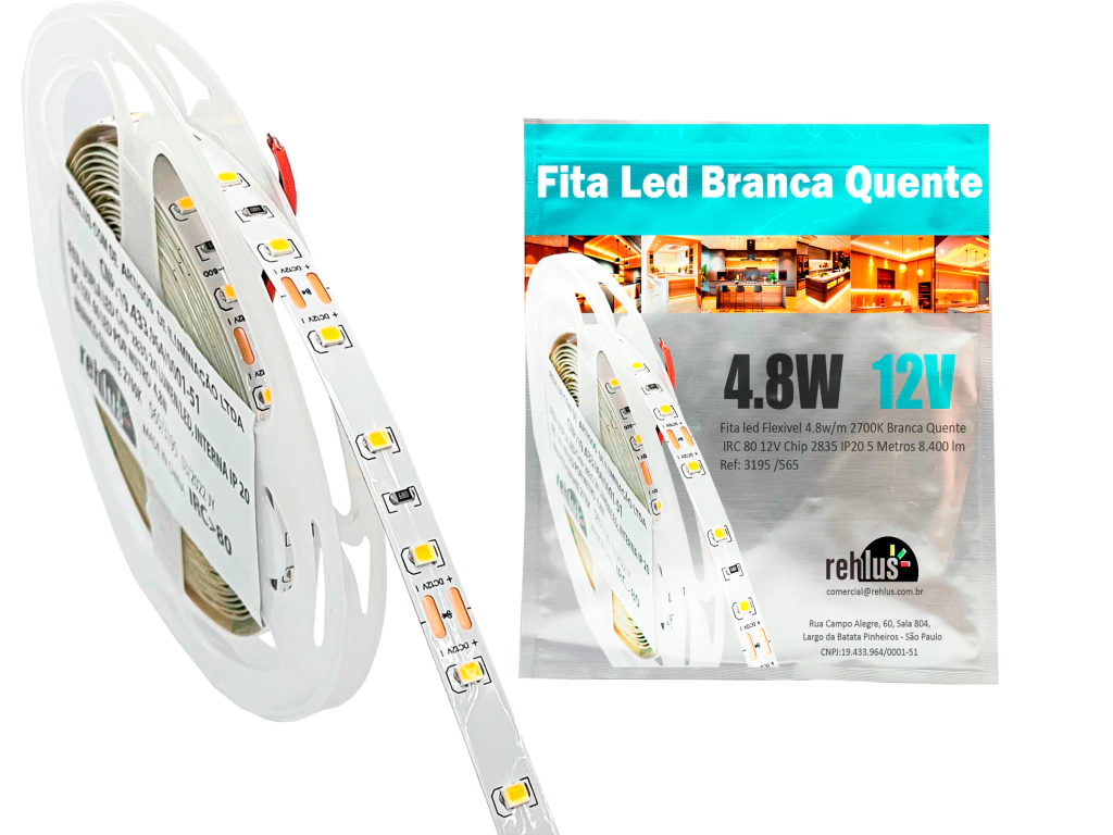 Fita led Flexivel 4.8w/m 2700K Branco Quente IRC 80 12V Chip 2835 IP20 5 Metros 8.400 lm Ref: 3195 /565